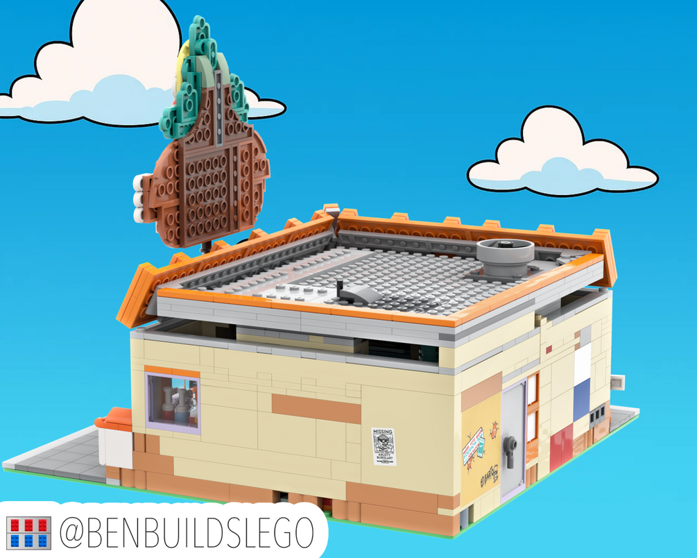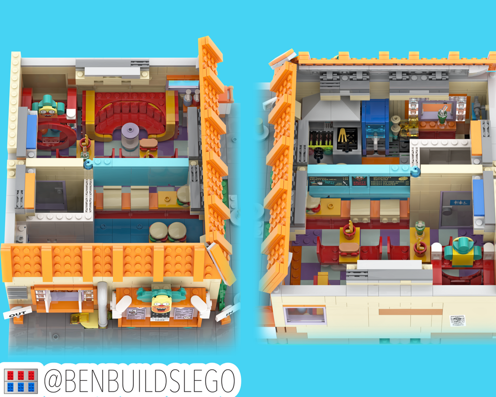 This modification of the official Krusty Burger set transforms the original design into a fully compatible modular corner building.  While the original set is full of fun references, I found that it suffered from awkward angles and underwhelming views from most perspectives. This redesign refines the set by repositioning the drive-thru window and order booth to the same side, while showcasing the long bay of windows on the opposing wall.